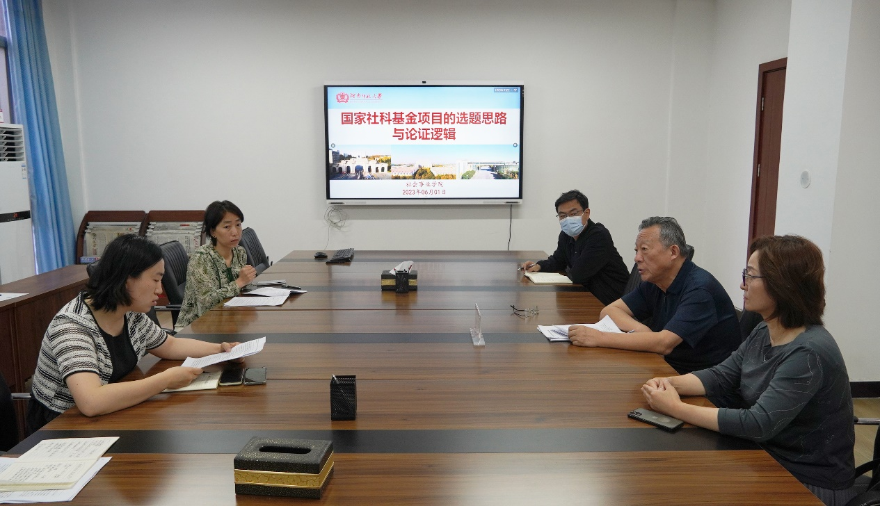 童星围绕选题、实地调查的可实施性、学科特色等方面对学院教师申报的国家社科基金项目选题进行点评,并详细指出了在项目概念、具体实例、评价指标、内容用词等方面需要调整完善的地方。他表示在申报国家社科基金项目时,要精准定位指标体系,明确选报方向和准确引用文献,突出选题和研究内容的创新性、独特性。会上,童星与师生进行互动,就所提问题进行专业解答,现场气氛热烈,师生受益匪浅。