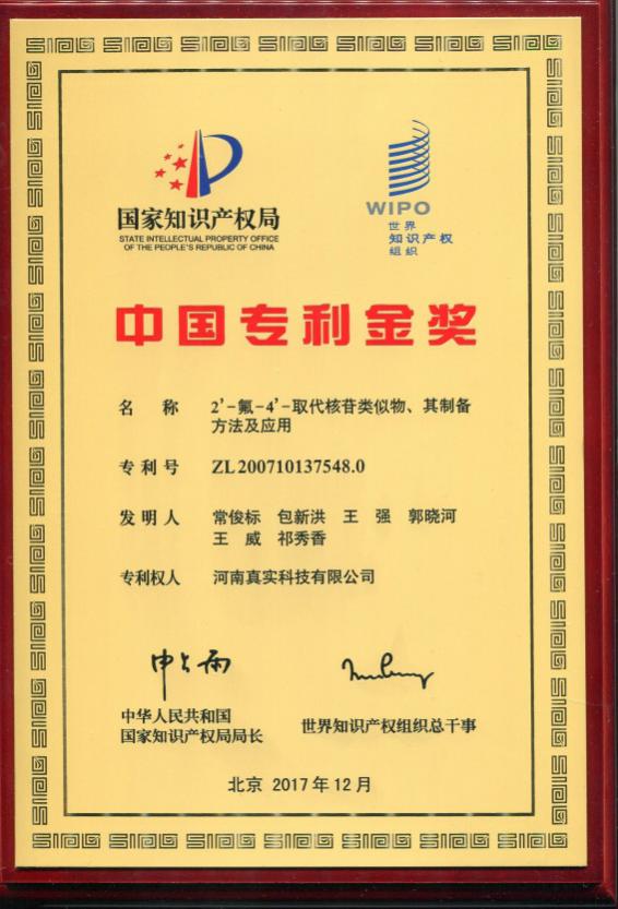 为了全面贯彻党的十九大精神,加快创新型国家建设,大力推进创新驱动发展战略和知识产权战略,国家知识产权局根据《中国专利奖评奖办法》的规定,经部门推荐,中国专利奖评审委员会评审,国家知识产权局和世界知识产权组织审核,我校常俊标教授作为发明人授权的发明专利“2’-氟-4’-取代核苷类似物、其制备方法和应用(ZL200710137548.0)”荣获中国专利金奖,今年全国共有1554项优秀专利参加评选,最终评出20项中国专利金奖(国知发管字〔2017〕77号)。此次中国专利金奖的获得彰显了该发明在促进科技创新和推动经济社会发展中做出的卓越贡献。