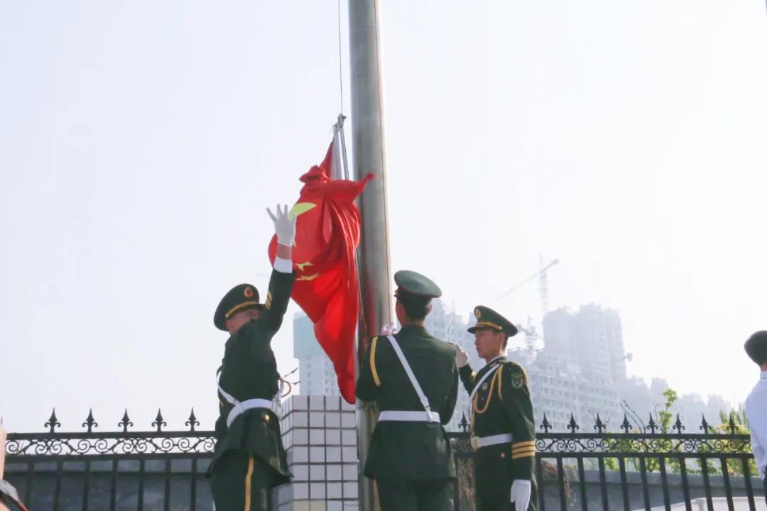刘玉芳宣布我校第五十九届运动会开幕式正式开始。五星红旗在庄严的国歌声中冉冉升起。校旗和运动会会旗伴着校歌依次升起。