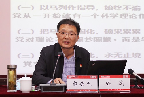 韩斌从理论联系实际、感悟思想伟力、做实“两个维护”、更好开局起步等四个方面,从大历史观视角出发,通过讲述鲜活生动的党史故事,剖析深刻理性的社会发展规律,深刻解读了党的理论联系实际作风在百年党史中的特殊历史意义,论述了党的百年党史“以马列作指导,始终不渝;把马列中国化,硕果累累;把马列时代化,永无止境”的理论探索主题,论证了习近平新时代中国特色社会主义思想是理论联系实际的结晶,是党的初心和使命的最集中体现,是当代中国马克思主义、21世纪马克思主义。通过对党的十八大以来一系列历史性成就和历史性变革的跟进溯源,呼吁广大师生要深刻领悟党的理论创新是百年党史的指路明灯、胜利法宝,党中央的集中统一领导是党的独特优势和力量所在,呼吁广大师生要以史鉴今,将对党史学习的思想认同转化为增强“四个意识”、坚定“四个自信”、做到“两个维护”的政治自觉、历史自觉和行动自觉,转化为“十四五”开局起步的辉煌成就。报告内涵丰富,深入浅出,对深刻理解理论联系实际作风,开展好党史学习教育具有重要指导意义。