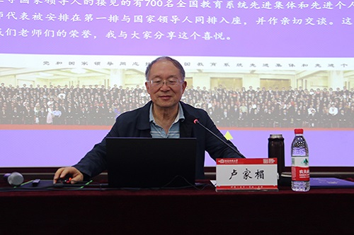 为提升教师教学技能,增强业务本领,推动学校党史学习教育走深走实,5月27日下午,我校在物理北楼三楼报告厅举办“名师课堂”暨“学党史 强本领 开新局”专题报告会。国家教学名师、上海师范大学教授卢家楣应邀来我校作报告。校党委书记赵国祥主持报告会,相关职能部门负责人、各教学单位教学副院长、新入职教师代表、附属中学、附属小学及未来名师班学员等共计370余人参加此次报告会。