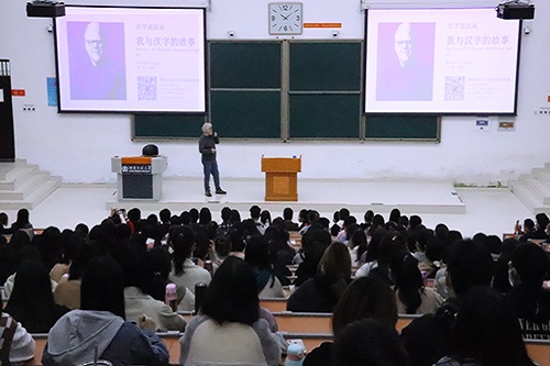 理查德•西尔斯以“汉字叔叔说我与汉字的故事”为题,结合自身二十多年学习汉语和研究汉字字源的经历,图文并茂地向师生们分享了他在中国的生活、对汉字的热爱、创办汉字字源网站的过程和部分汉字类型。他以“手”“声”“友”等一些简单常用的汉字为例,用一幅幅古书中的字形讲解一个个方块字背后的源头和演变。他就汉字起源、汉语学习等内容与在场师生进行了深入有趣的互动交流,生动形象的分享博得现场师生的热烈掌声。