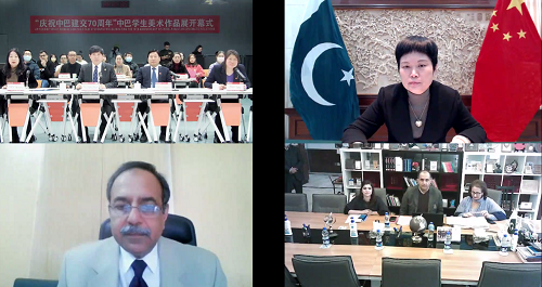 12月2日,由河南师范大学和巴基斯坦萨戈达大学、巴基斯坦千禧教育集团联合举办的“庆祝中巴建交70周年”中巴学生美术作品展开幕式在我校启智楼现教中心演播厅举行。中国驻巴基斯坦大使馆公使庞春雪,河南省教育厅二级巡视员徐恒振、对外合作与交流处副处长蔡弘受邀出席,校党委副书记陈广文,萨戈达大学中国研究中心主任拉赫曼,千禧教育集团首席运营官穆什塔克、传媒外联及语言部总监扎基尔,我校相关学院负责人、师生代表参加了开幕式。开幕式由国际合作与交流处处长赵扬主持。