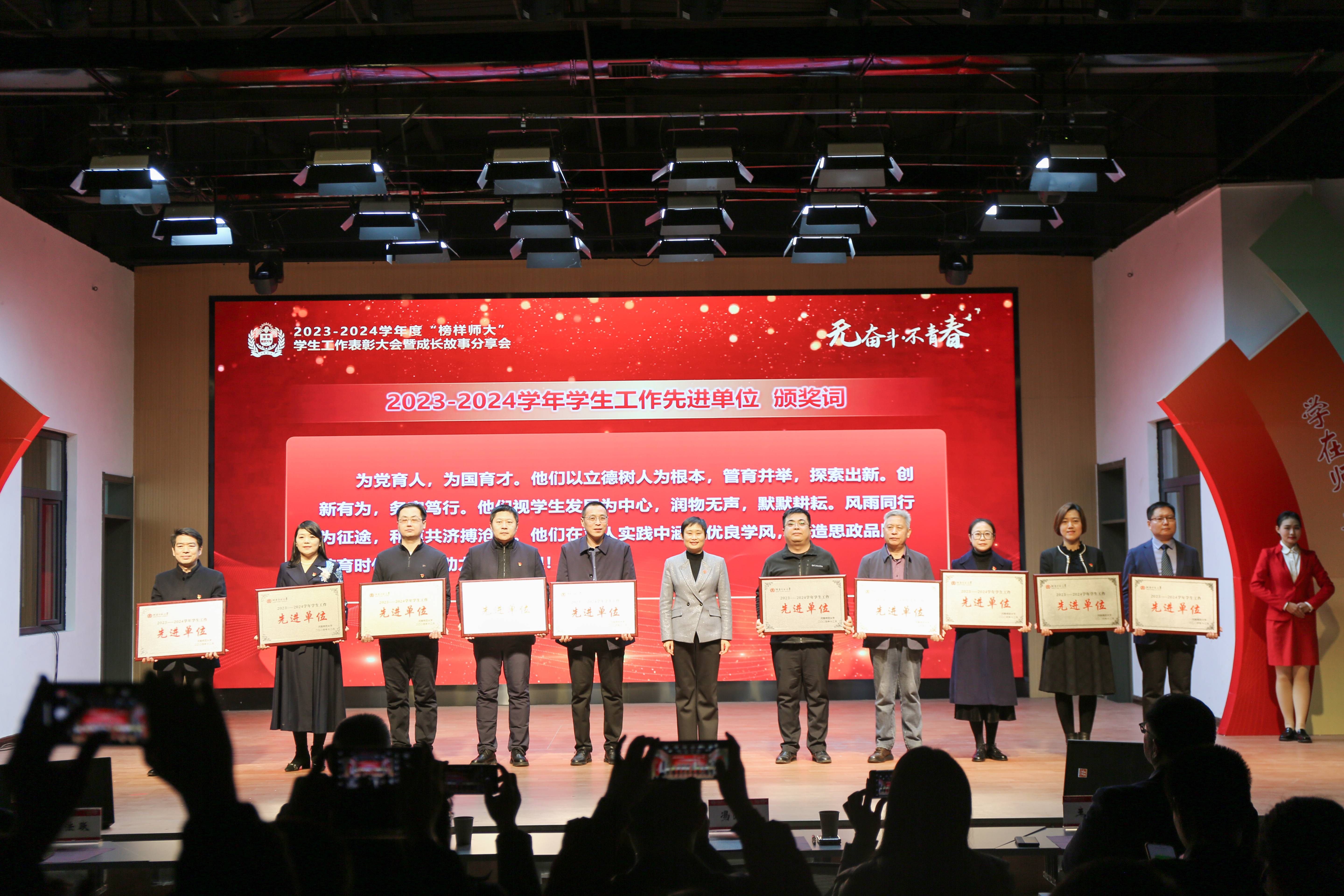 会议开始前,与会师生一同观看了2023-2024学年度学生工作回顾视频《无奋斗 不青春》,校党委常委、副校长聂国兴宣读《河南师范大学2023-2024学年度学生工作表彰通报》。校领导分别为2023-2024学年度学生工作先进单位、2024年征兵工作先进单位、先进班集体、学生先进个人颁奖。