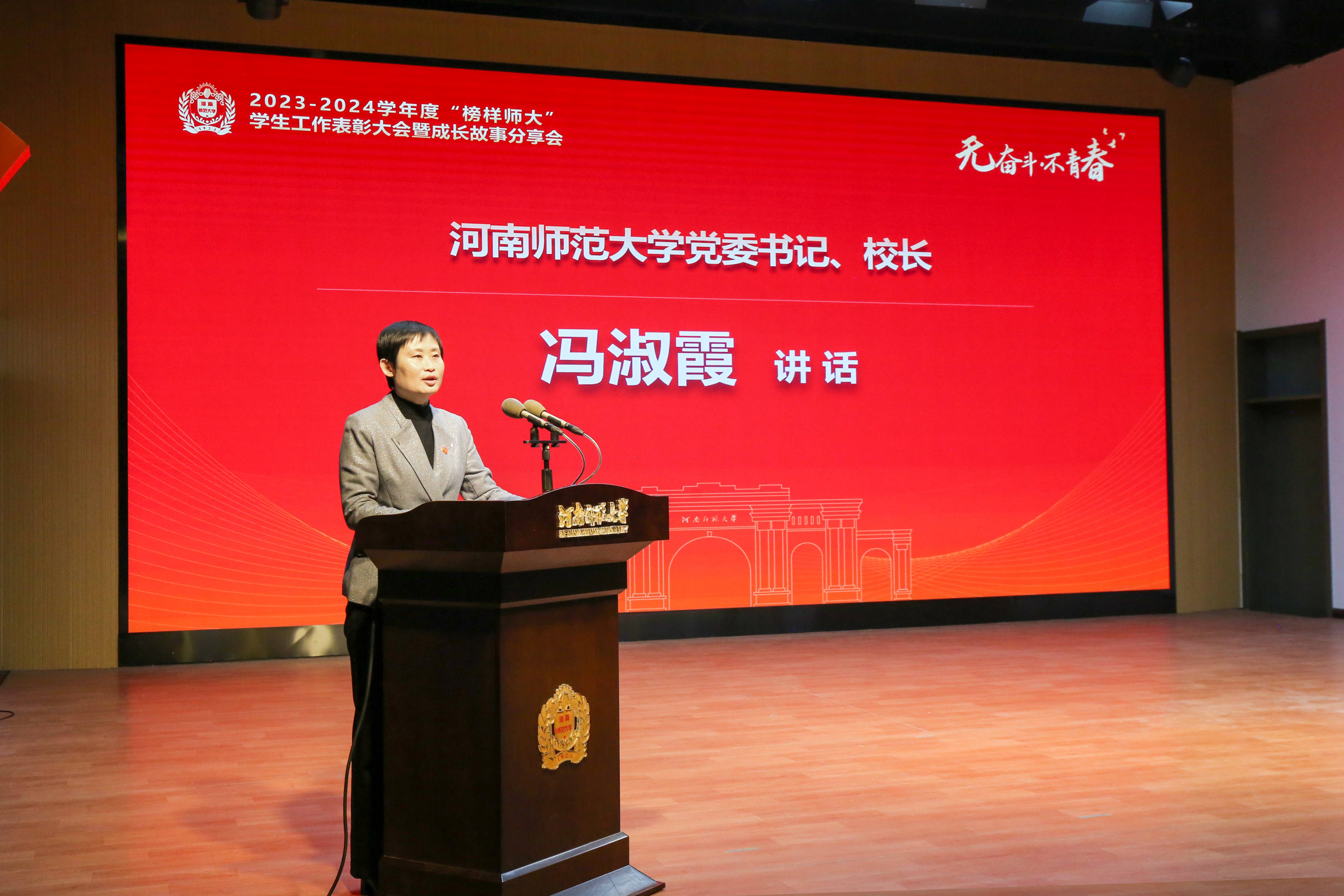 校党委书记、校长冯淑霞在讲话中指出,一年来学校学生工作按照“保安全、提认知、创品牌、育英才”的工作思路,深入实施“铸魂”“成长”“夯基”“暖心”“赋能”工程,全力服务学生成长成才,立德树人成效不断彰显。为进一步学习和弘扬先进榜样敢为人先、奋力拼搏的宝贵精神,冯淑霞提出三点要求,一是坚守初心,做师大精神的传承者和践行者。全校各单位要发扬师大优良传统,勇于担当使命,抓实学风建设,凝聚育人合力,着力培养符合社会需求、具备“硬核实力”的强国青年。二是实干笃行,做学生成长的引路人和知心人。广大学生工作者要夯实育人本领,坚持一线思维,加强阵地建设,真抓实干、一以贯之,不断提高育人的针对性和实效性。三是奋勇争先,做勇攀高峰的奋斗者和追梦者。全体同学要树立报国强国大志向,锤炼善作善成真本领,争做挺膺担当奋斗者,不断超越自我,努力攀登高峰,让青春在不懈奋斗中更加闪亮,在努力拼搏中焕发光彩。