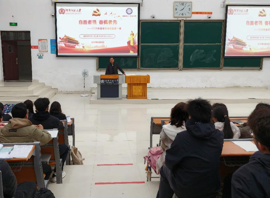 3月9日晚,国际教育学院于文昌楼102教室举办主题为“自胜者强,奋楫者先”的开学思政第一课。思政课由学院党委书记田小勇主讲,全体辅导员、留管干部及2024级学生参加。
