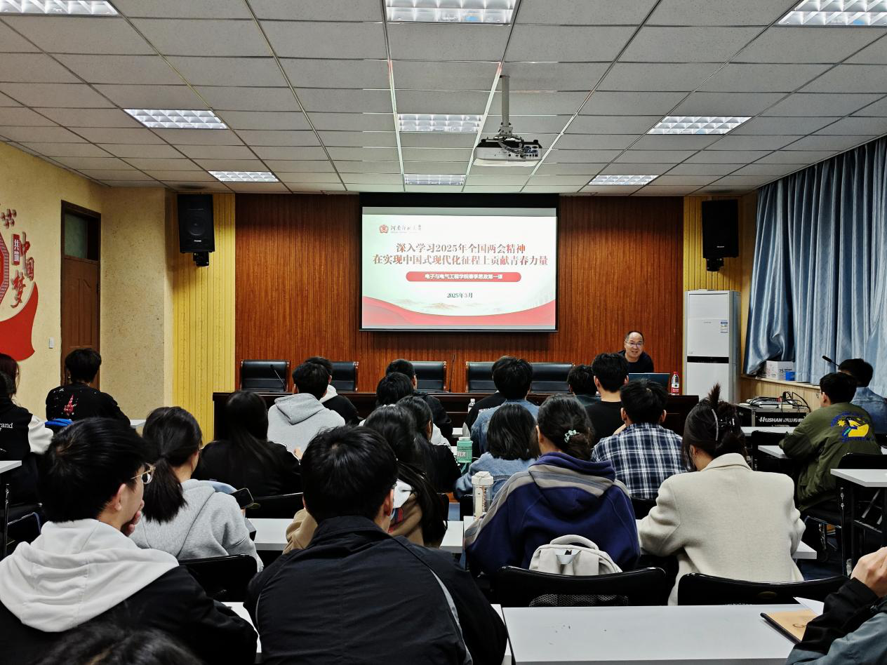 为深入学习2025年全国两会精神,引导青年学生坚定理想信念,积极投身时代发展,3月20日晚,电子与电气工程学院在学院C208会议室开展春季开学思政第一课。思政课由学院党委书记高飞主讲,2024级学生参加。