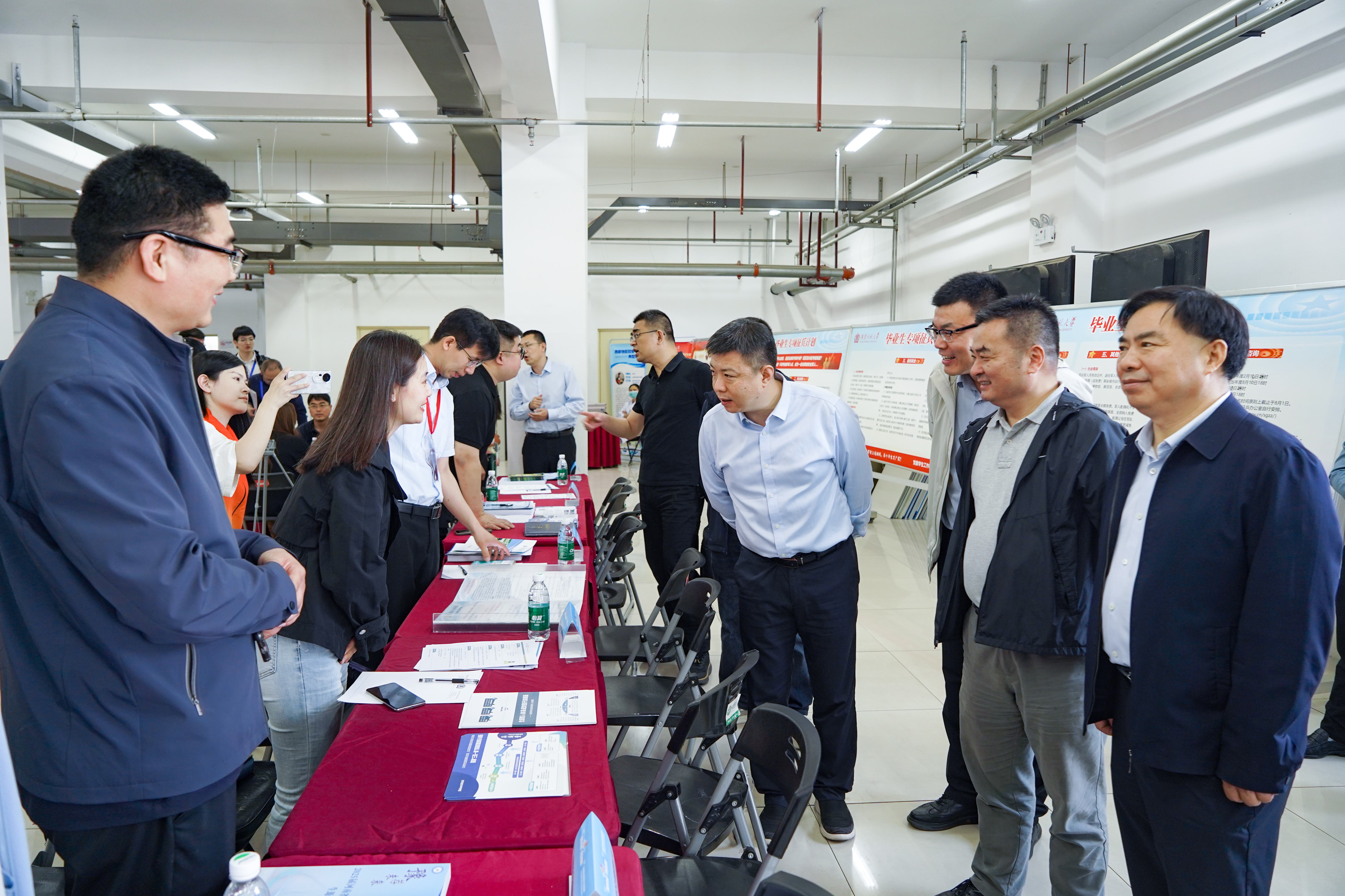 方伟与吕冰等领导到校企对接会现场逐一走访各企业展位,详细了解岗位需求情况和薪资待遇,并与校企代表就产教融合协同育人、就业实习基地建设、订单式人才培养等话题进行了深入探讨。