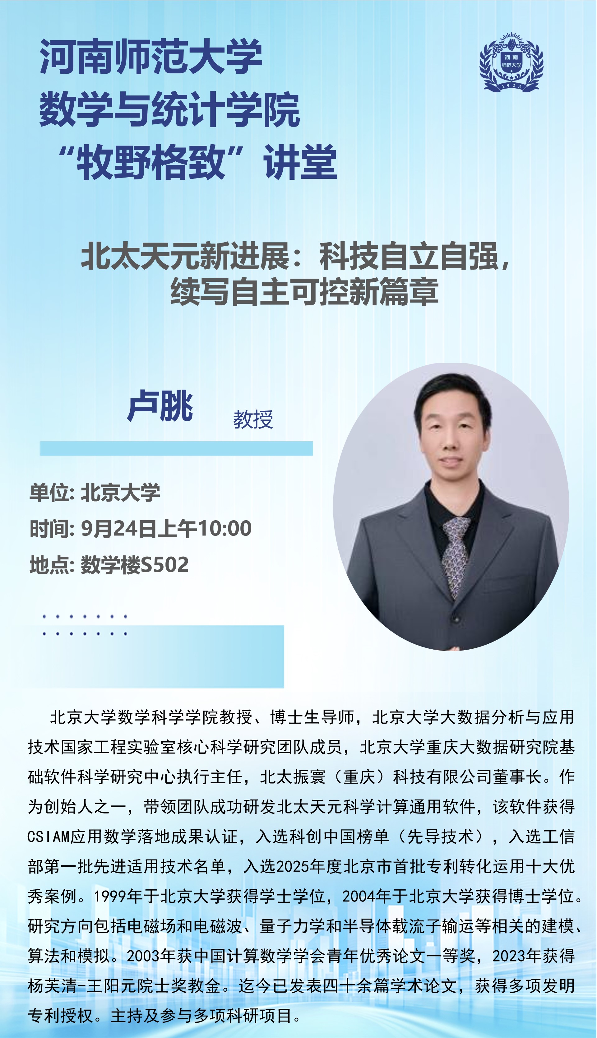 北京大学卢朓教授将应邀做客“牧野格致”讲堂