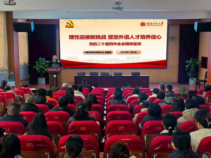 为深入学习贯彻党的二十届四中全会精神,12月2日下午,外国语学院在学院报告厅举办党的二十届四中全会精神专题宣讲会。院党委书记吴耀武担任主讲,学院领导班子、全体教职工及学生代表参加。