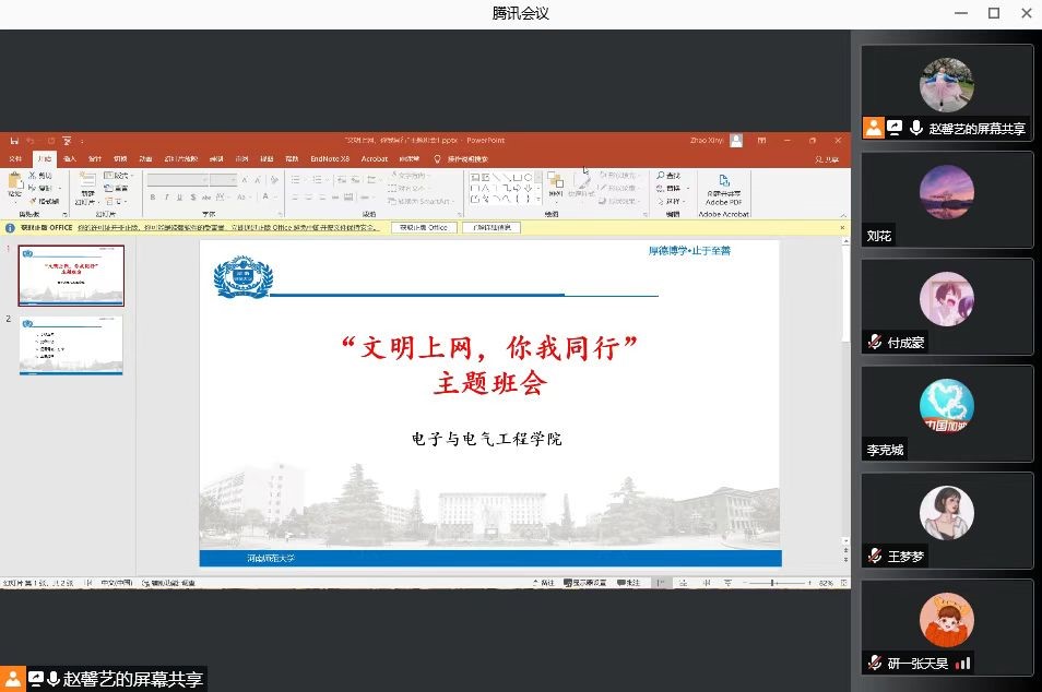 为让学生深入学习网络安全法律法规和文明上网行为规范等内容,普及网络文明知识。3月18日中午,我院研究生辅导员赵馨艺老师组织我院全体研究生开展以“文明上网、你我同行”为主题的线上班会。