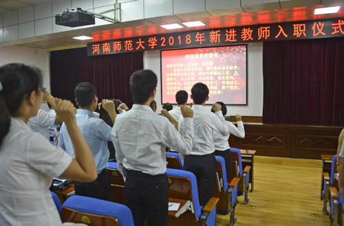仪式开始前,全体新教师观看了学校形象推介片《桃李春风》,了解学校的办学历史和发展成就。伴随着全体人员慷慨激昂的校歌奏唱,仪式正式开始。