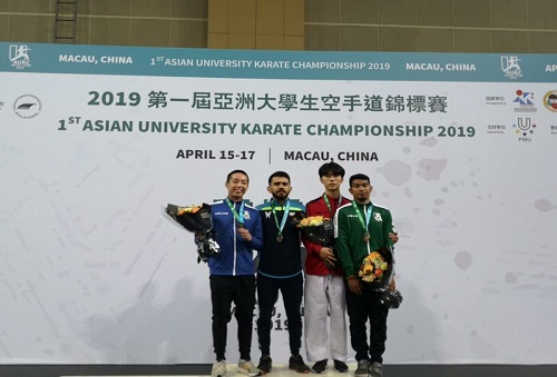 4月17日,首届亚洲大学生空手道锦标赛在中国澳门落下帷幕,共有来自伊朗、日本、马来西亚等11个国家和地区的代表团参赛。中国代表团此次派出7名运动员参加了比赛的决逐,共获得1金、3银、2铜的优异成绩。来自我校体育学院2016级运动训练专业的学生任立强获得了男子组手-60公斤级的铜牌。