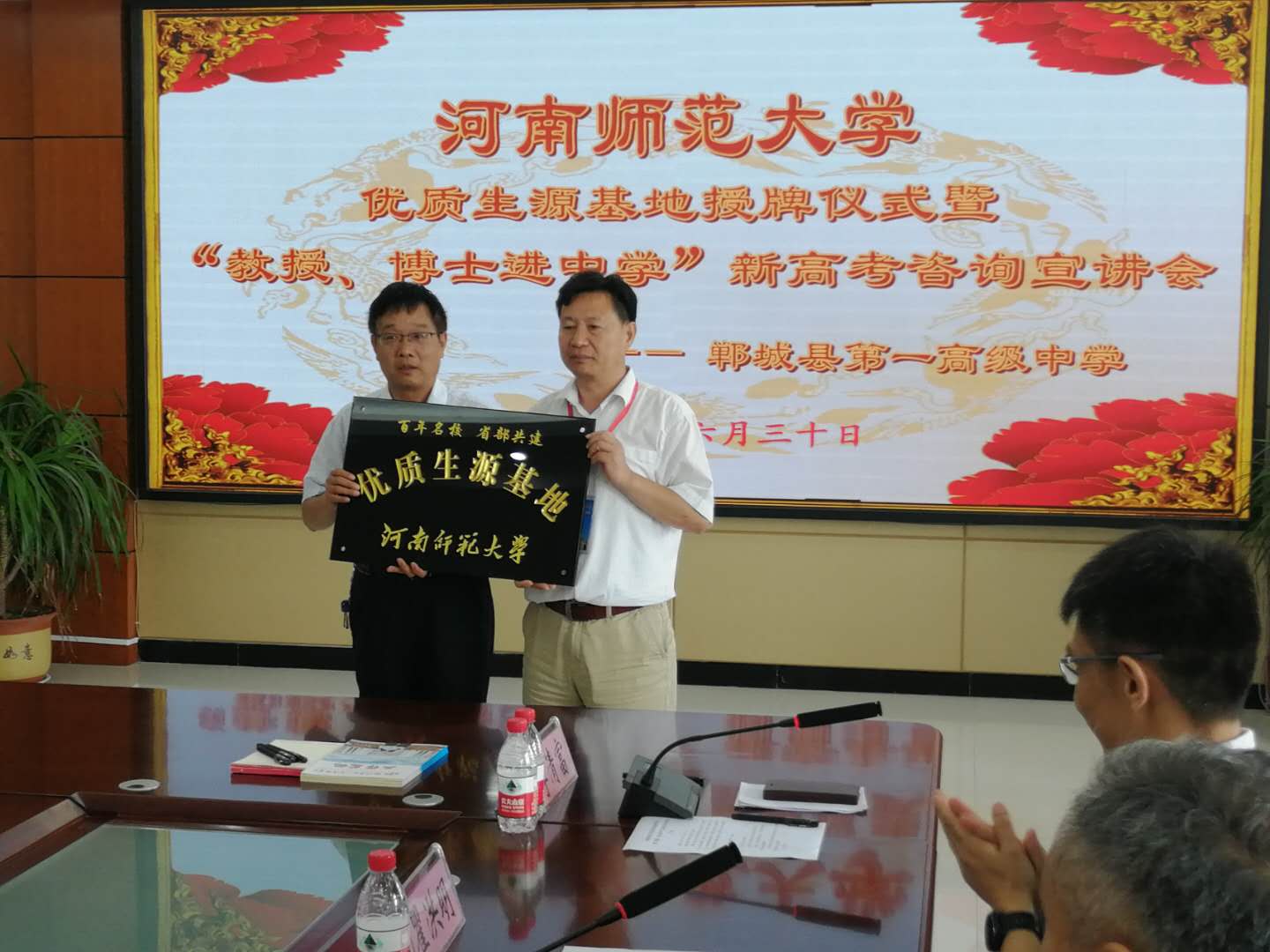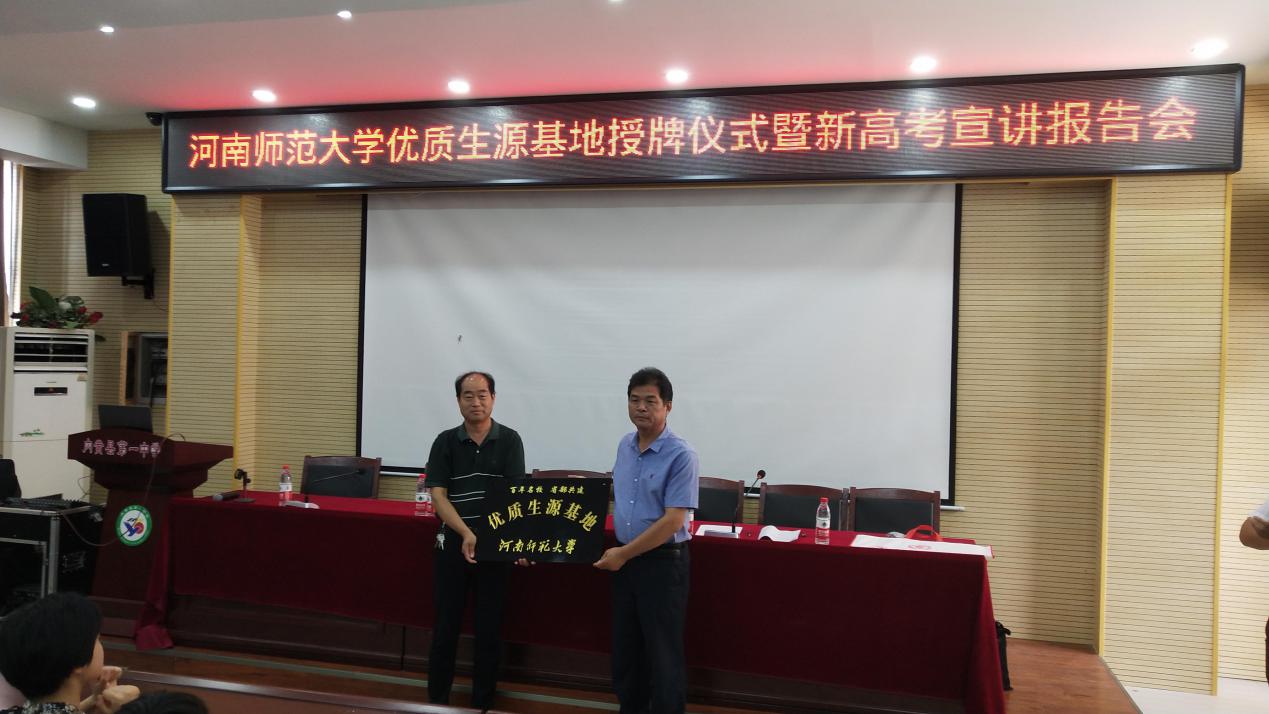 校招生办公室副主任瞿洪明代表我校与郸城县第一高级中学签订了“河南师范大学优质生源基地合作协议书”,李清富为郸城县第一高级中学授予“优质生源基地”牌匾。