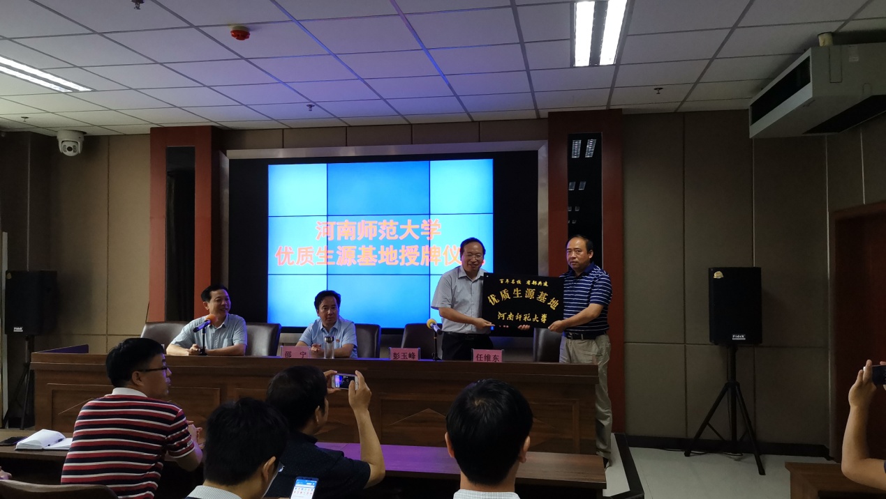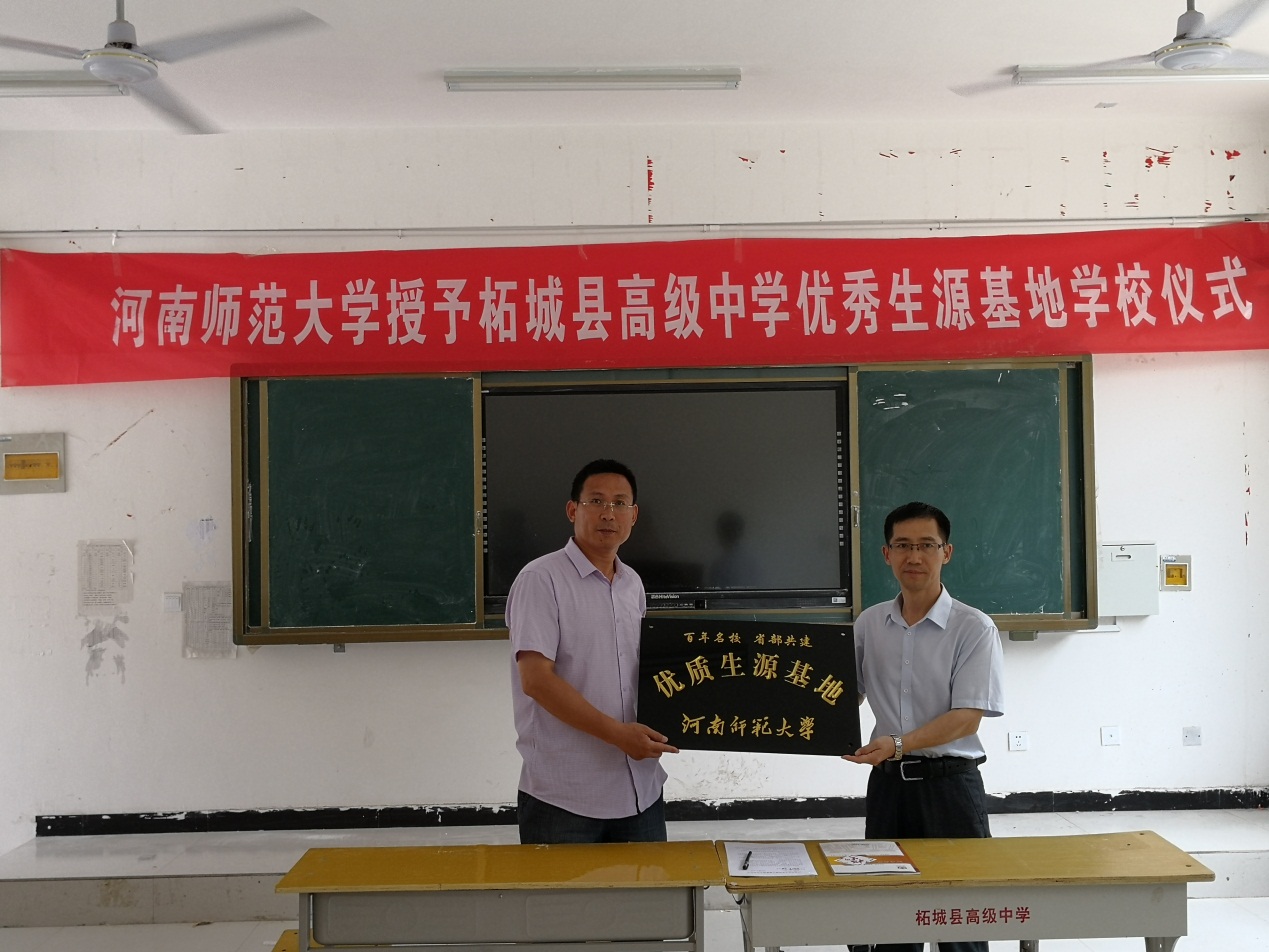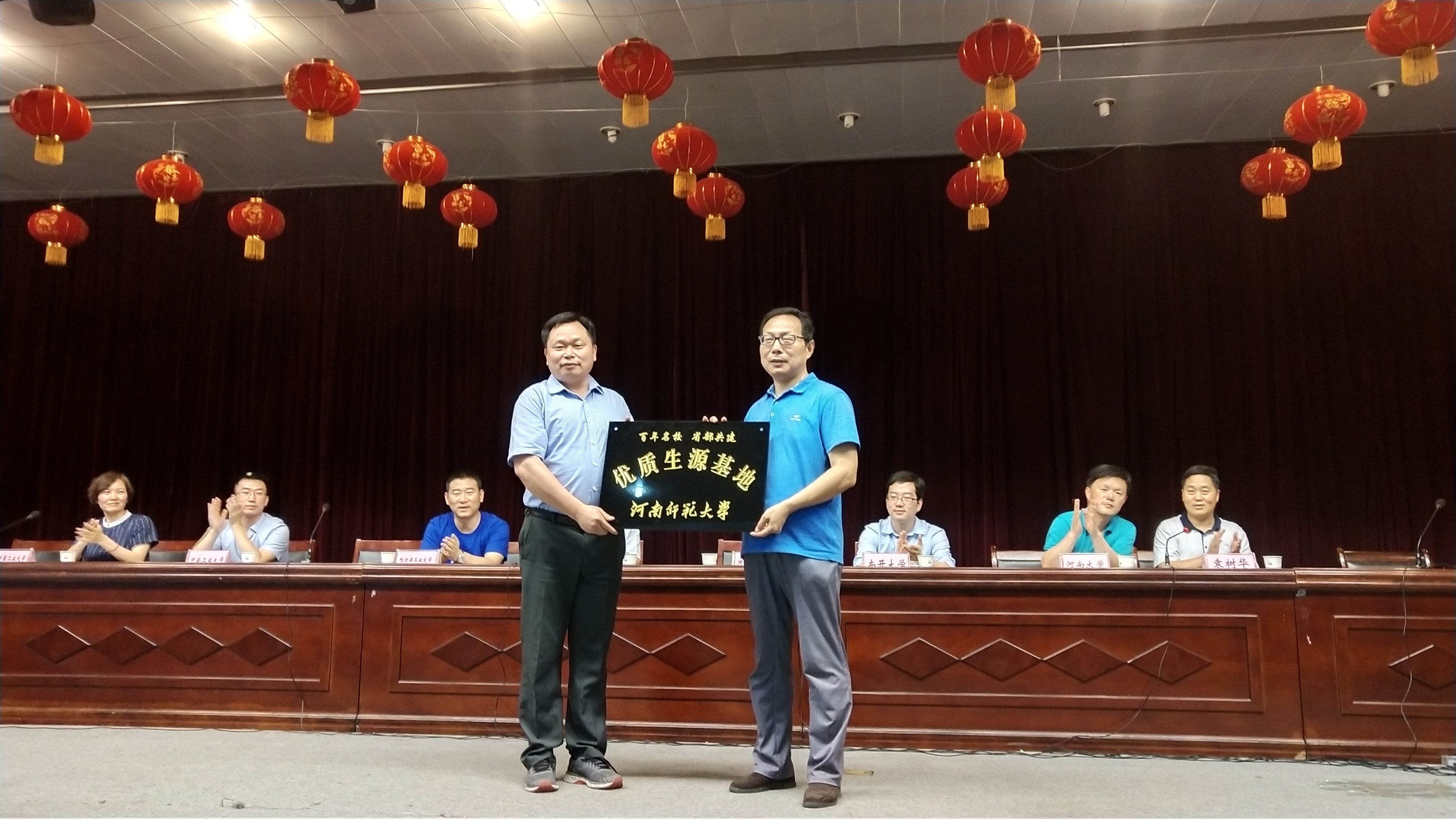化学化工学院党委书记来俊军代表学校与柘城县一高签订了“河南师范大学优质生源基地合作协议书”,并为其授予“优质生源基地”牌匾。