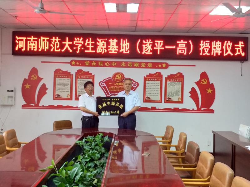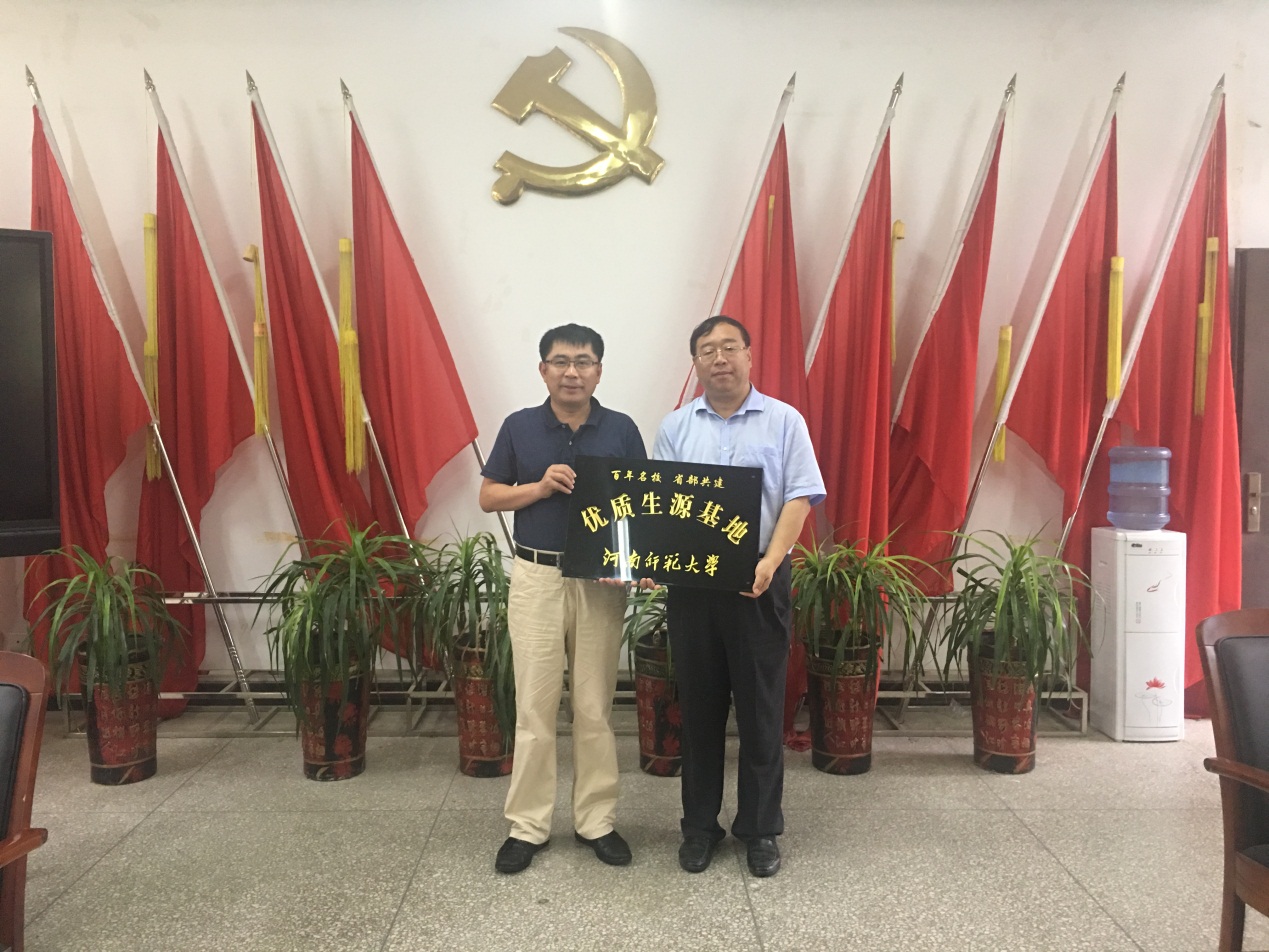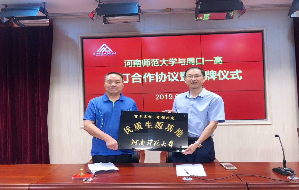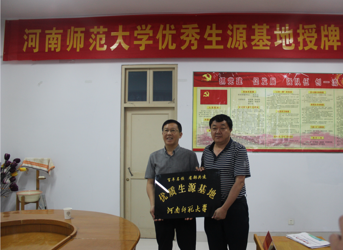 化学化工学院党委书记来俊军代表学校与柘城县一高签订了“河南师范大学优质生源基地合作协议书”,并为其授予“优质生源基地”牌匾。