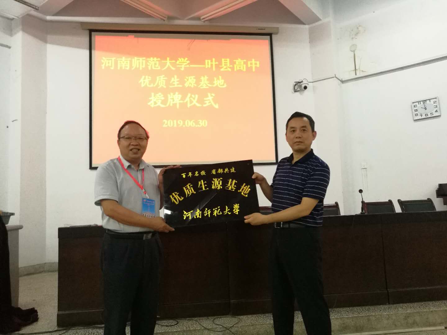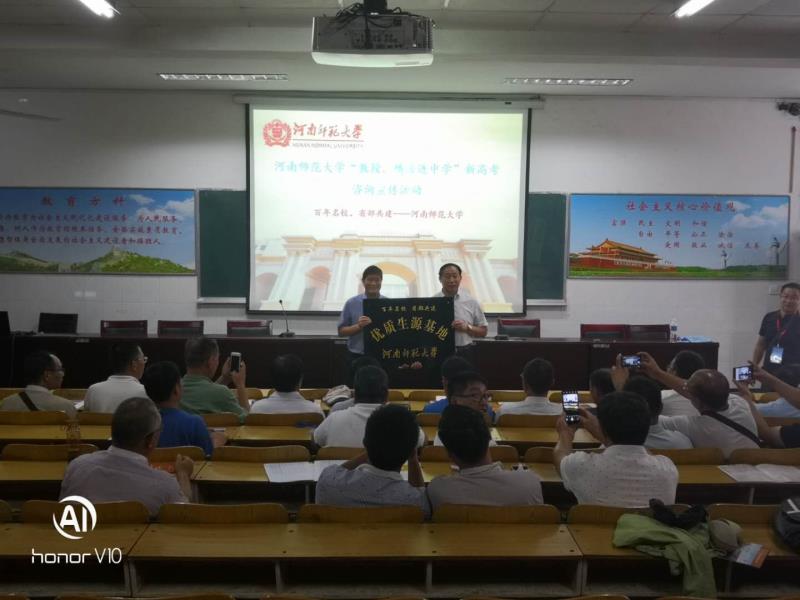 6月22日至30日,旅游学院先后走进栾川县第一高级中学、临颍一高、驻马店高级中学、漯河第四高级中学及漯河实验高级中学开展了“教授、博士进中学”宣讲活动,并与栾川县第一高级中学、驻马店高级中学签署了《河南师范大学优质生源基地合作协议书》,举行了“优秀生源基地”授牌仪式。