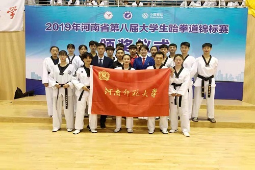 我校跆拳道队由体育学院教师梁潇、司幸伟任教练,带领18名运动员分别参加了本科院校甲组(普通大学生组)、乙组(体育教育组)、丙组(运动训练高水平组)竞技项目的比赛。经过激烈比拼,甲组代表队共获得两枚金牌、一枚银牌,乙组代表队共获四枚金牌、一枚银牌,丙组代表队斩获六枚金牌、一枚银牌。在团体竞赛中,丙组男子团体竞赛和乙组女子团体竞赛都获得第三名的好成绩。赛后,我校被省教育厅授予“河南省跆拳道示范校”称号,梁潇、司幸伟被授予“优秀指导教师”称号。