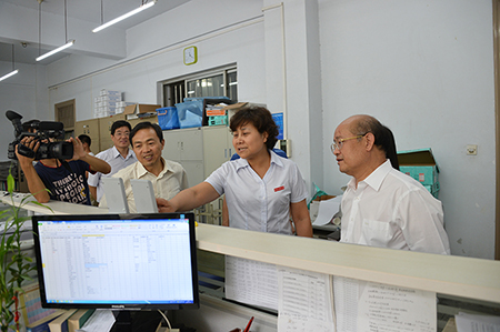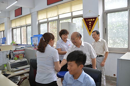 徐燕鹏处长向周书记一行介绍了我处迎新收费工作的整体安排情况,并陪同周书记一行到缴费大厅进行视察。收费大厅工作秩序井然,收费工作有条不紊地进行,周书记与参加收费的工作人员一一握手致意,并向工作人员详细了解学生的缴费情况和一卡通的办理情况。对辛勤工作在一线的教师和银行人员表示感谢,并嘱咐大家要坚守岗位,认真做好迎新的相关工作。