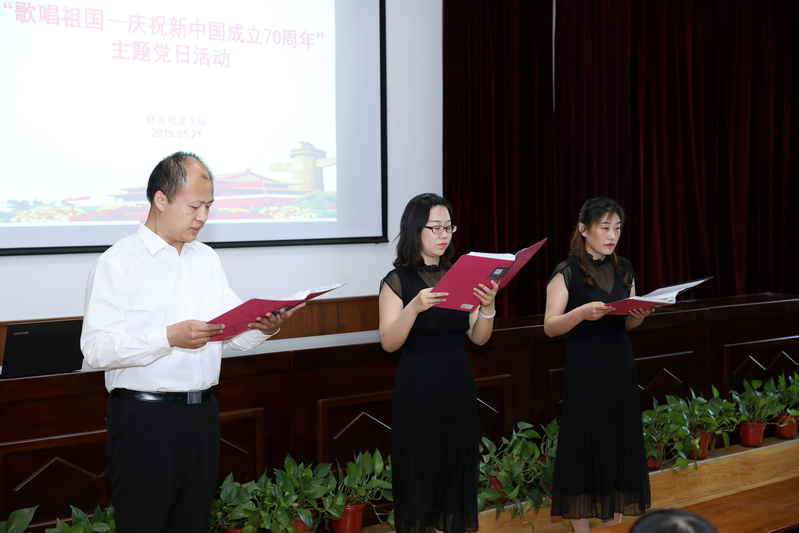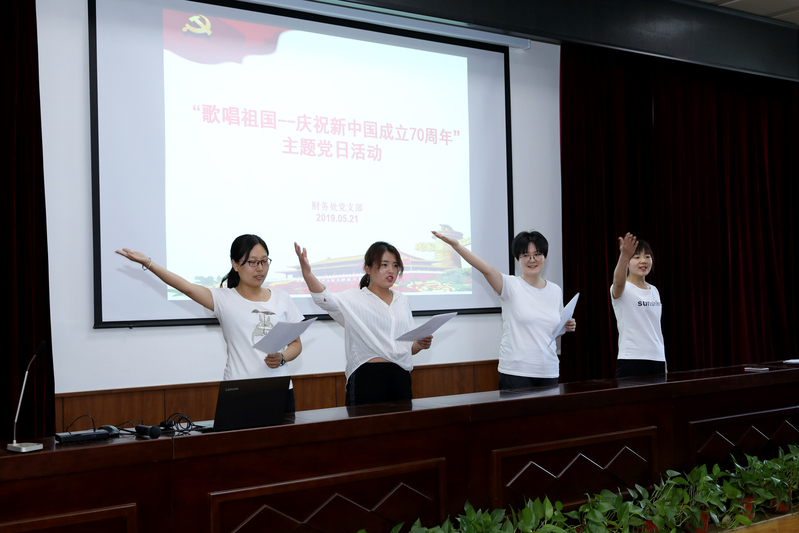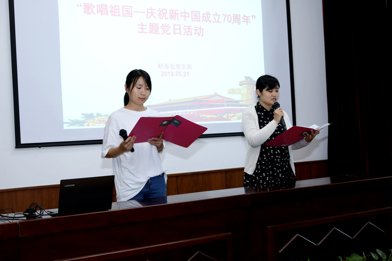 5月21日下午,财务处党支部组织全体职工在党校教室开展“歌唱祖国——庆祝新中国成立70周年”主题党日活动。