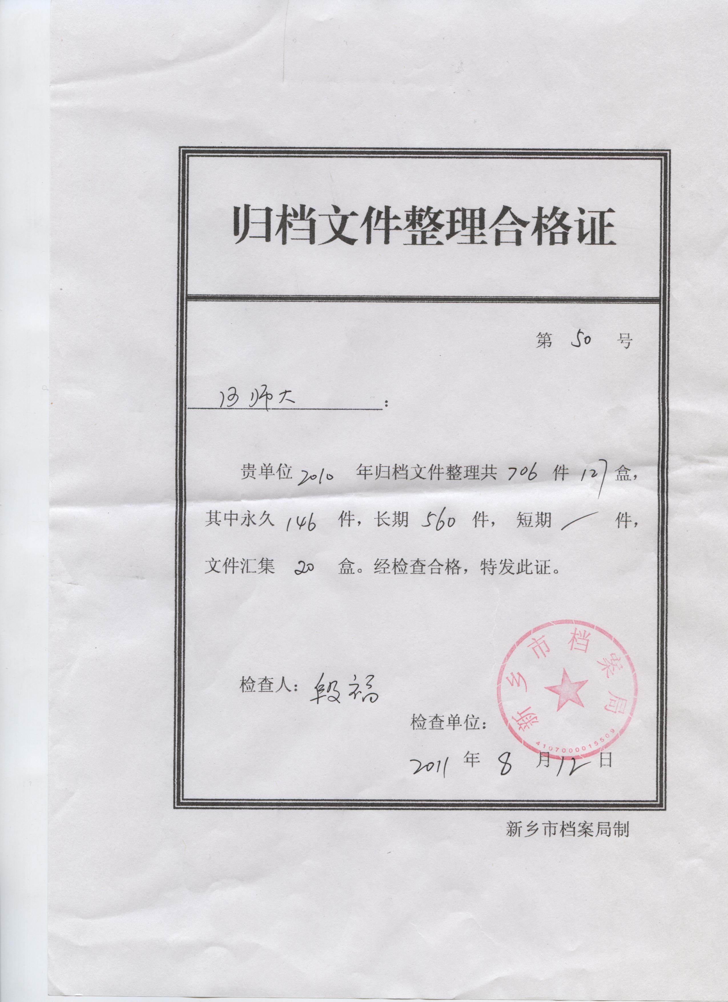 12月19日,河南师范大学档案馆综合档案室获新乡市档案局颁发《归档文件整理合格证》。