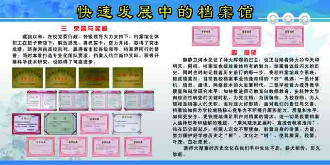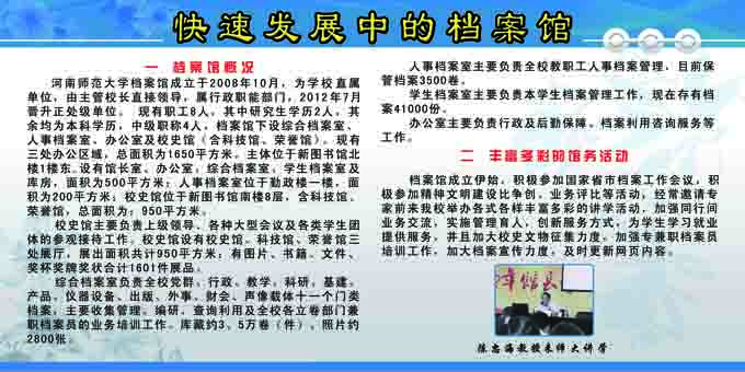 “双节”以来,档案馆通过悬挂纪念条幅、制作宣传展板、印发调查问卷等方式,向广大师生宣传《档案法》和我校档案事业发展成绩,普及档案知识,提高档案意识,增强法制观念,赢得师生广泛好评。