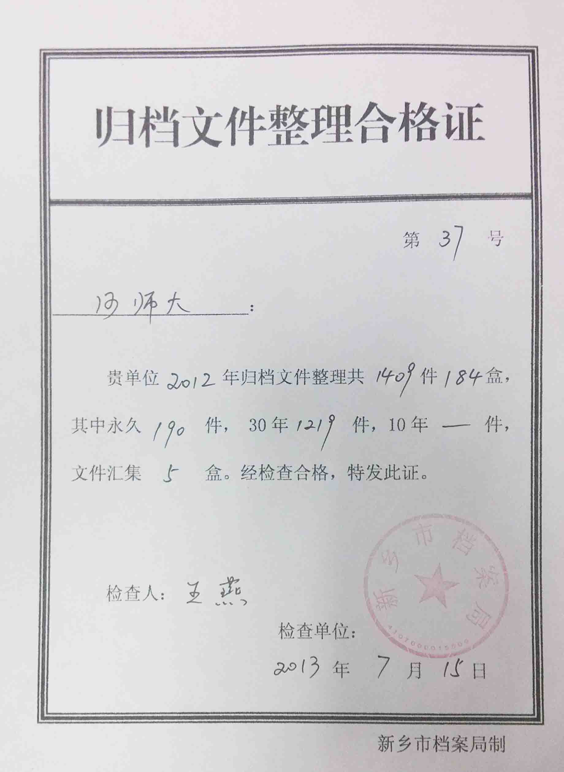 7月15日,河南师范大学档案馆综合档案室获新乡市档案局颁发《归档文件整理合格证》。