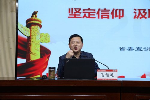 马福运以“坚定信仰 汲取力量 强化担当”为题,从党员干部为什么要学党史切入,通过一个个生动鲜活的故事,一张张刻骨铭心的照片,讲述了共产党人持续推进理论创新、矢志践行初心使命、筚路蓝缕奠基立业、创造辉煌开辟未来的百年历史。他从开天辟地的救国大业、改天换地的兴国大业、翻天覆地的富国大业、惊天动地的强国大业、感天动地的万里长征、战天斗地的抗灾救灾、顶天立地的科技强国、欢天喜地的伟大成就等八个方面,把百年党史的波澜壮阔、苦难辉煌,把中国共产党人的初心与使命、智慧与担当讲得既有思想高度,又有理论深度,既有情感温度,又有实践厚度,赢得在场观众阵阵掌声。马福运围绕牢记初心使命,从党史中积聚发展力量;坚定理想信念,从党史中吸收精神营养;提高治理能力,从党史中丰富执政本领;保持清醒头脑,从党史中汲取经验教训四个方面宣讲了党员干部学党史的重要意义,并强调了学习党史的目标要求和科学方法。