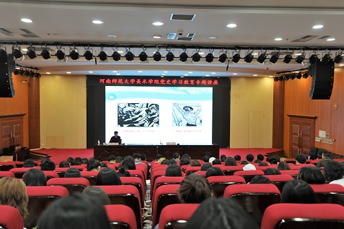 余保刚教授以《文艺与政治:以延安时期木刻版画为例》为题,围绕“毛泽东的文艺观”“毛泽东文艺观指导下的文艺工作”“践行毛泽东文艺观的典型人物:刘文西”“新时代艺术创作要坚持以人民为中心”四个方面,用丰富详实的史料,结合自身理论研究,进行了系统讲解和深入阐释。报告主题鲜明、内涵丰富、思想深刻,将党史学习教育与文化艺术创作紧密结合起来,既有理论高度,又有实践指导,对于结合美术专业特色扎实开展好党史学习教育,具有现实指导意义。