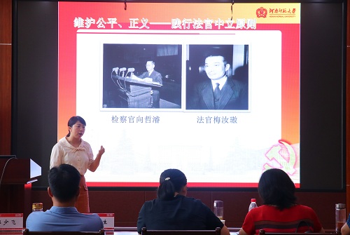 为进一步推进课程思政改革,将百年党史元素融入课堂,强化青年教师立德树人理念,不断提高青年教师教学能力,打造高水平、专业化教师队伍,6月1日下午,法学院在崇法楼301室举办“传承红色基因,弘扬法治精神”青年教师课堂教学比赛。校教学督导组相关专家、教学名师和学院相关负责人担任评委,学院部分教师、学生观看比赛。比赛由学院副院长胡光主持。