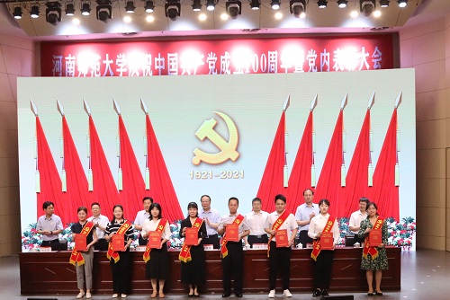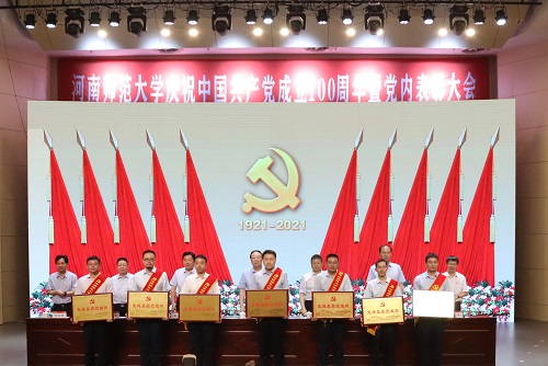 梅宪宾宣读荣获河南省高校先进基层党组织、先进个人名单以及《中共河南师范大学委员会关于表彰2020-2021学年度先进基层党组织和先进个人的决定》。全校共有6个基层党组织被评为河南省高校先进基层党组织;4名同志被评为河南省高校优秀共产党员;4名同志被评为河南省高校优秀党务工作者;7个先进基层党委(党总支)、38个先进教工党支部、15个先进学生党支部、140名教职工优秀共产党员、46名学生优秀共产党员和60名优秀党务工作者荣获河南师范大学2020-2021学年度先进基层党组织和先进个人荣誉称号并上台领奖。全国党建工作标杆院系、化学化工学院党委书记来俊军,受表彰教师党员代表、商学院教师周芳,受表彰学生党员代表、计算机与信息工程学院学生苏畅分别发言,深切表达对党的百年华诞的衷心祝福。