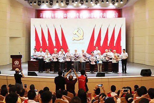 赵国祥代表校党委向老党员、受表彰的先进集体和先进个人致以崇高的敬意和热烈的祝贺。赵国祥表示,在中国共产党百年华诞之际,党史学习教育正在全国上下如火如荼地开展,学校发挥组织优势、资源优势、专业优势、干部优势,开展了精彩纷呈的活动,掀起了一轮又一轮的学习热潮。回顾百年党史,每一段都值得铭记,每一页都值得珍藏。在党的领导下,学校98年来始终坚守“精育良才、教育报国”初心使命,以振兴中国教育事业为己任,扎根中原大地,矢志培育社会主义建设者和接班人,累计培养各类人才30余万。特别是学校第十二次党代会召开以来,全校上下解放思想、开拓创新、扬长补短,用“人和”争“天时”、换“地利”,学校一年一个台阶,不断实现跨越式发展。