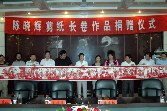 7月20日上午,美术学院2007届毕业生陈晓辉剪纸长卷作品捐赠仪式在勤政楼第三会议室举行。副校长王桂兰出席捐赠仪式并发表讲话,校长助理朱华北、宣传部长李勇、学生处处长张向战、美术学院党总支书记聂立清、美术学院院长陈克、校团委副书记岳杰勇和美术学院师生代表参加了捐赠仪式。