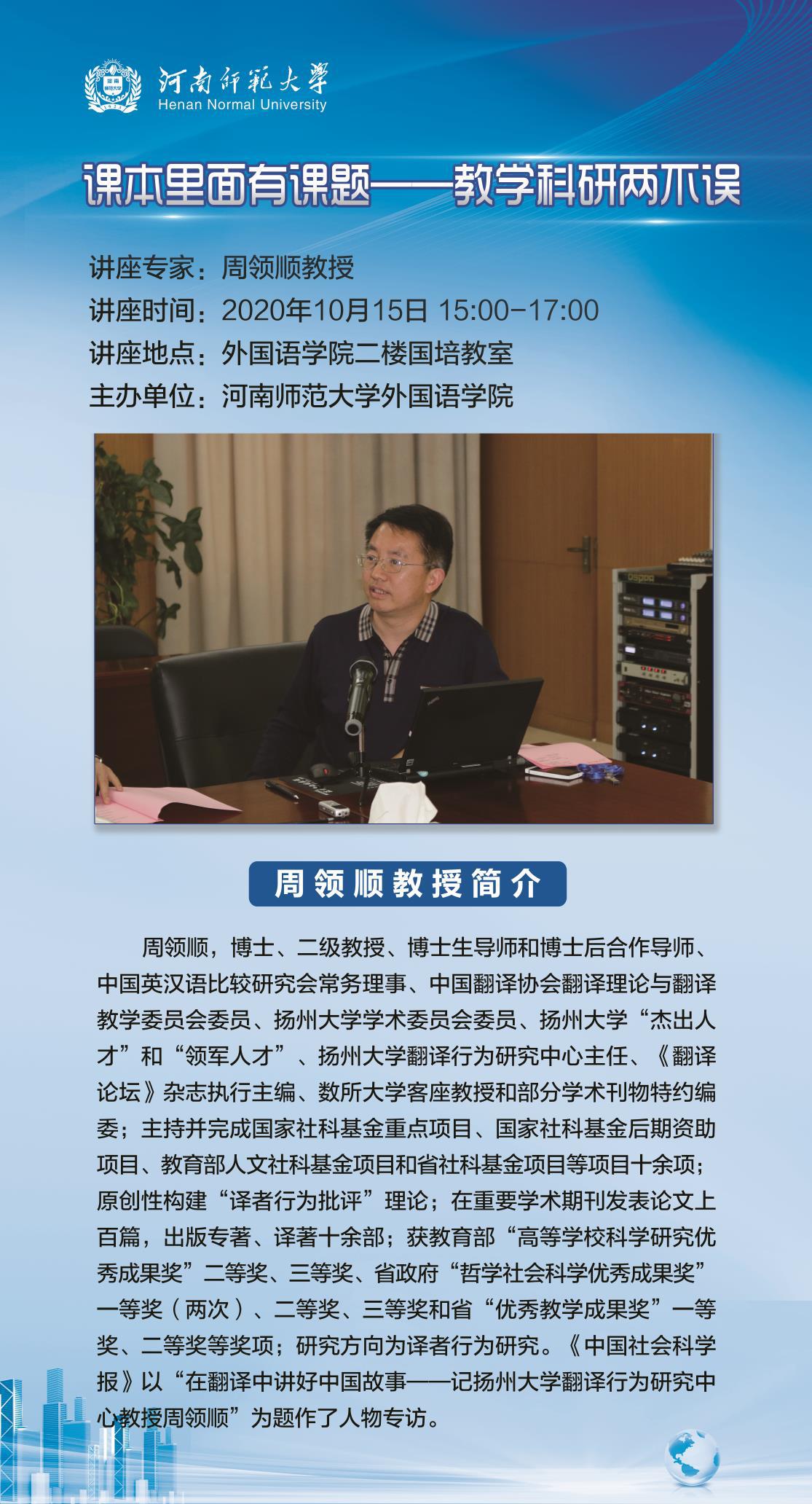 【预告】扬州大学博士生导师周领顺教授应我院邀请讲学