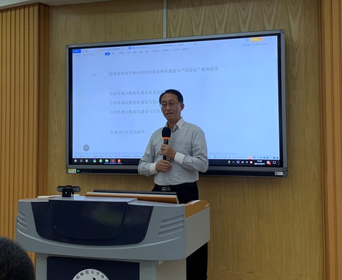 10月14日下午,应外国语学院邀请,国家社科基金学科评议组成员、广东外语外贸大学黄忠廉教授在智慧教室作了题为“有的放矢说选题凝练”的学术报告。学院师生及来自其他学院(部)的同仁近百人聆听了报告。讲座由外国语学院院长刘国兵教授主持。