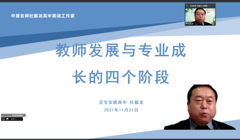 中原名师、河南省特级教师、灵宝实验高中副校长,杜振龙老师作了题为“教师发展与专业成长的四个阶段”的主旨发言,他结合自己的专业成长四个阶段:模仿教学期,站稳课堂期,反思教学期,总结升华期。以及这四个阶段他的做法与感悟,以期对即将走上工作岗位的青年学子们以启发和引领!