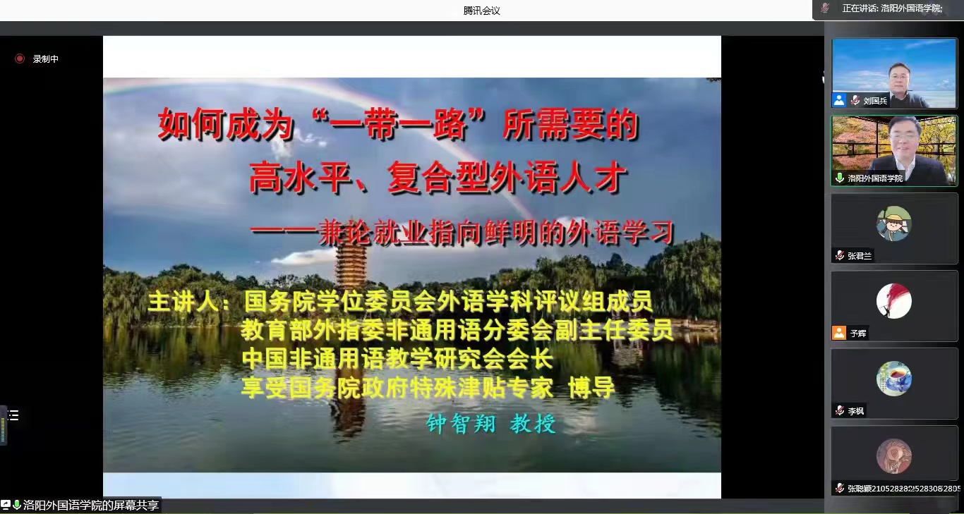 12月15日,应外国语学院邀请,国务院学位委员会外语学科评议组成员、战略支援部队信息工程大学钟智翔教授在线作了题为“如何成为‘一带一路’所需的高水平、复合型外语人才”的学术讲座。学院师生300余人参会学习。讲座由外国语学院院长刘国兵主持。