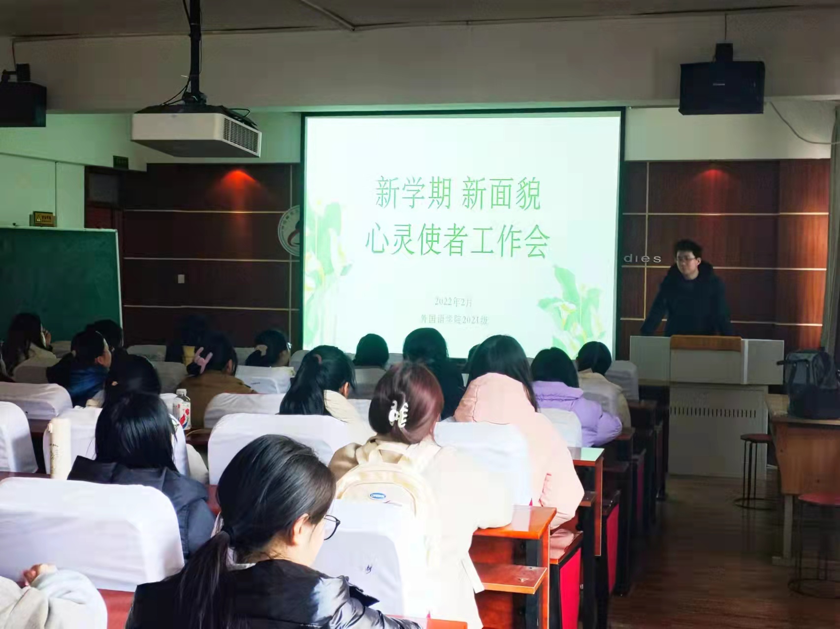 新学期伊始,为关注了解我院学生心理动态,及时进行正面引导。外国语学院2021级于2月23日在学院国培教室开展了以“新学期新面貌,心灵使者工作会”为主题的宿舍长工作会议。外国语学院辅导员钱江红担任主讲,外国语学院2021级全体宿舍长参加了本次培训。