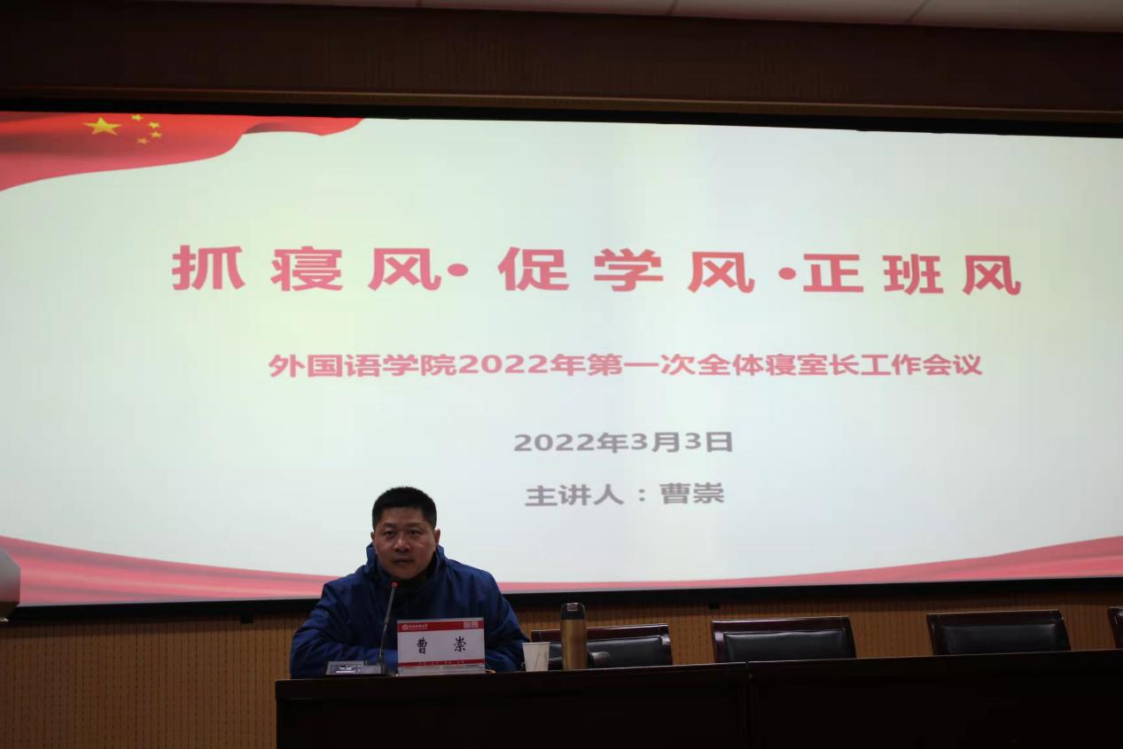 为加强学生干部队伍能力建设,响应学校“能力作风建设年”系列活动号召,督促学生干部不断提高工作标准,高质量开展各项工作,3月3日,外国语学院召开“抓寝风·促学风·正班风”全体寝室长工作会议,会议由学院党委副书记曹崇主讲,团委负责老师刘佳星主持,外国语学院全体寝室长准时参会。