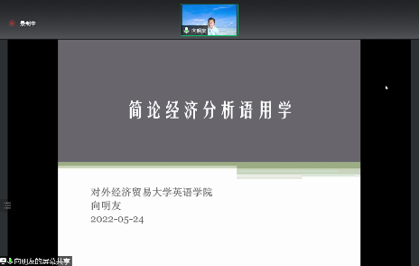 5月24日,应外国语学院邀请,国务院学位委员会“外国语言文学”学科评议组成员、教育部全国大学外语教学指导委员会副主任委员,对外经济贸易大学英语学院院长向明友教授在线作了题为“简论经济分析语用学”的学术报告。学院300余名师生参会学习。讲座由外国语学院院长刘国兵主持。