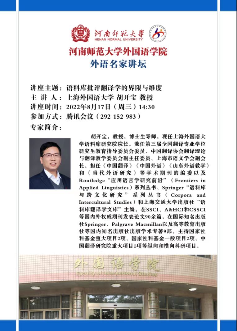 【预告】外语名家讲坛:语料库批评翻译学的界限与维度 上海外国语大学 胡开宝 教授