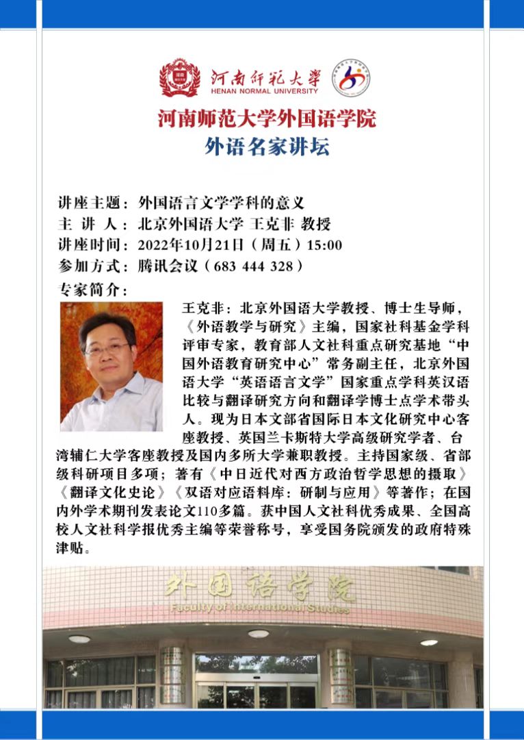 【预告】外语名家讲坛:外国语言文学学科的意义 北京外国语大学 王克非 教授
