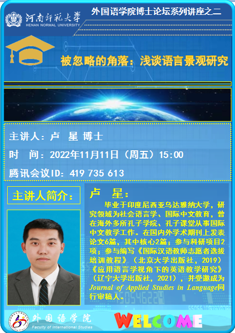 【预告】外国语学院博士论坛系列讲座:被忽略的角落:浅谈语言景观研究 卢星 博士
