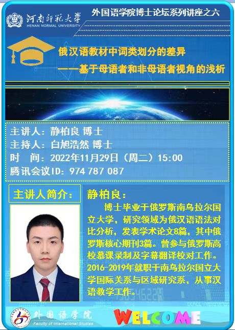 【预告】外国语学院博士论坛系列讲座:俄汉语教材中词类划分的差异——基于母语者和非母语者视角的浅析 静柏良 博士