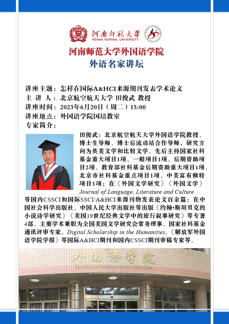 【预告】外语名家讲坛:怎样在国际A&HCI来源期刊发表论文 北京航空航天大学 田俊武 教授