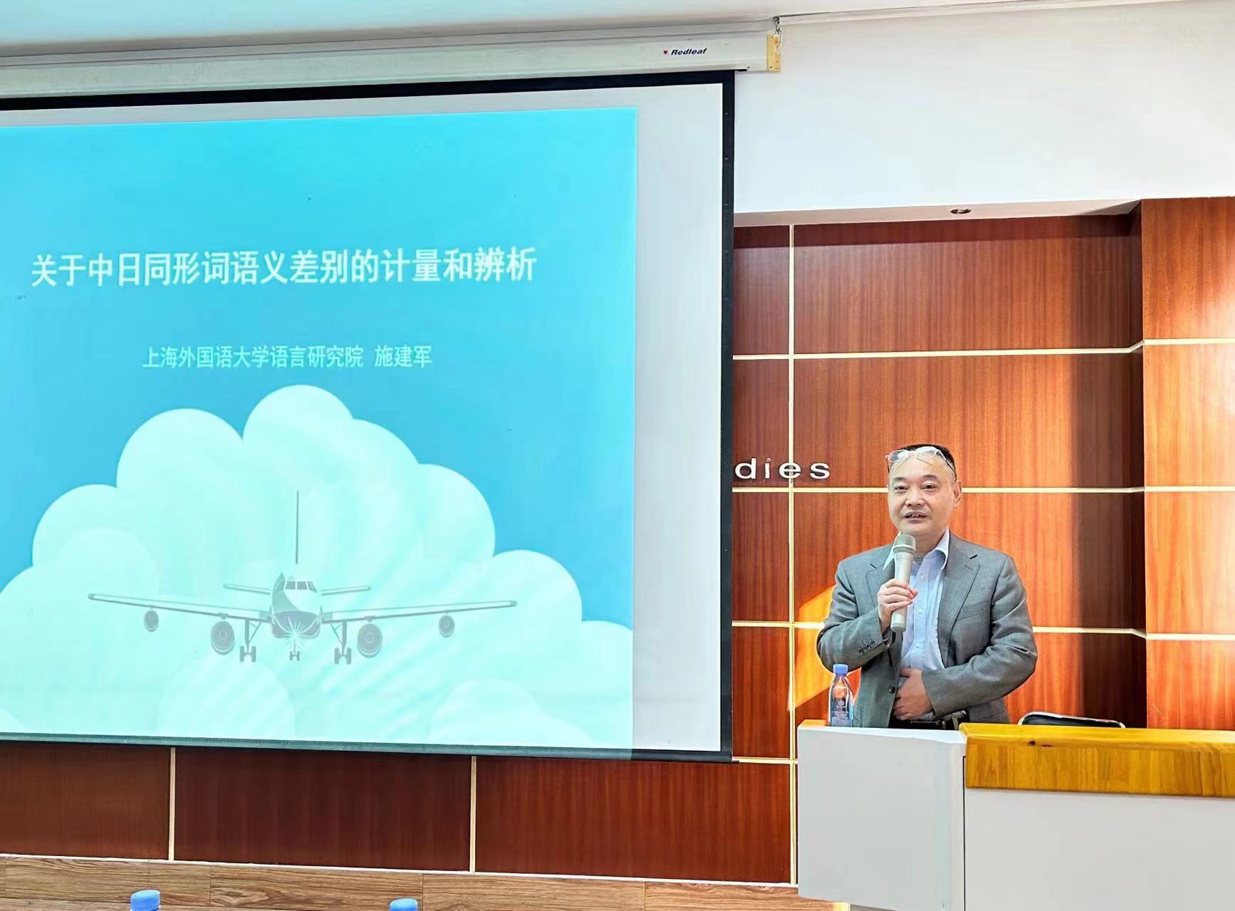 施建军指出,中日两国现代语言中存在大量通用的汉字词汇(同形词),由于这些词汇在两国语言中的意义用法不尽相同,给学习者带来方便的同时,也会造成误解。根据对大规模平行语料库的考察,同形近义词语义距离可以用量化的方法计量,其在中日之间的意义用法差异可以从语义、词性、句法成分、搭配等角度,用一种结构化方法进行描述。这种方法为系统性考察中日同形词的语义提供了可行的途径。报告结束后,与参会师生进行了互动与答疑。通过此次报告,聆听者对中日同形词的语义差别有了清晰的认知,拓宽了学术视野,启迪了科学思维。