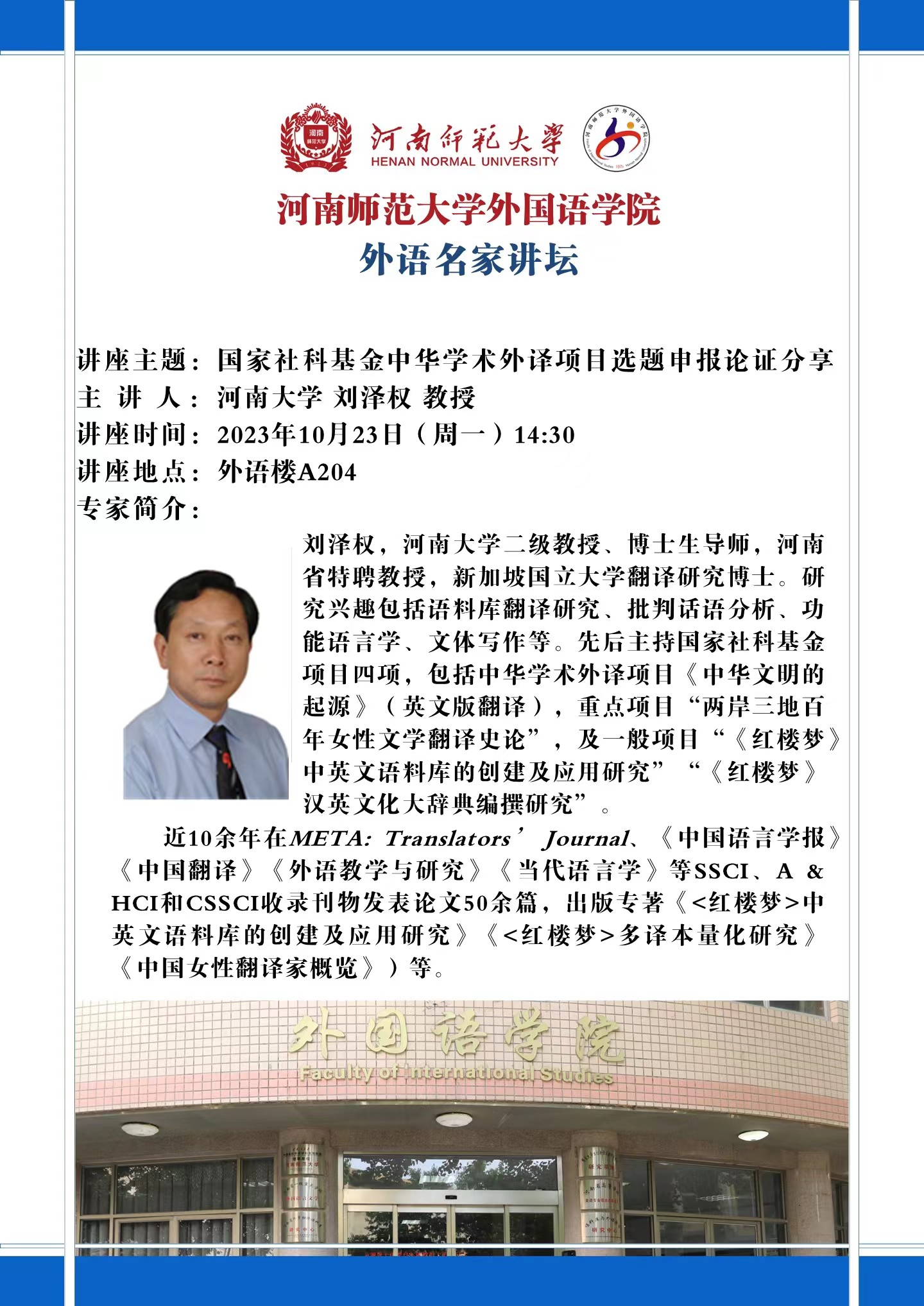 【预告】外语名家讲坛:国家社科基金中华学术外译项目选题申报论证分享 河南大学 刘泽权 教授