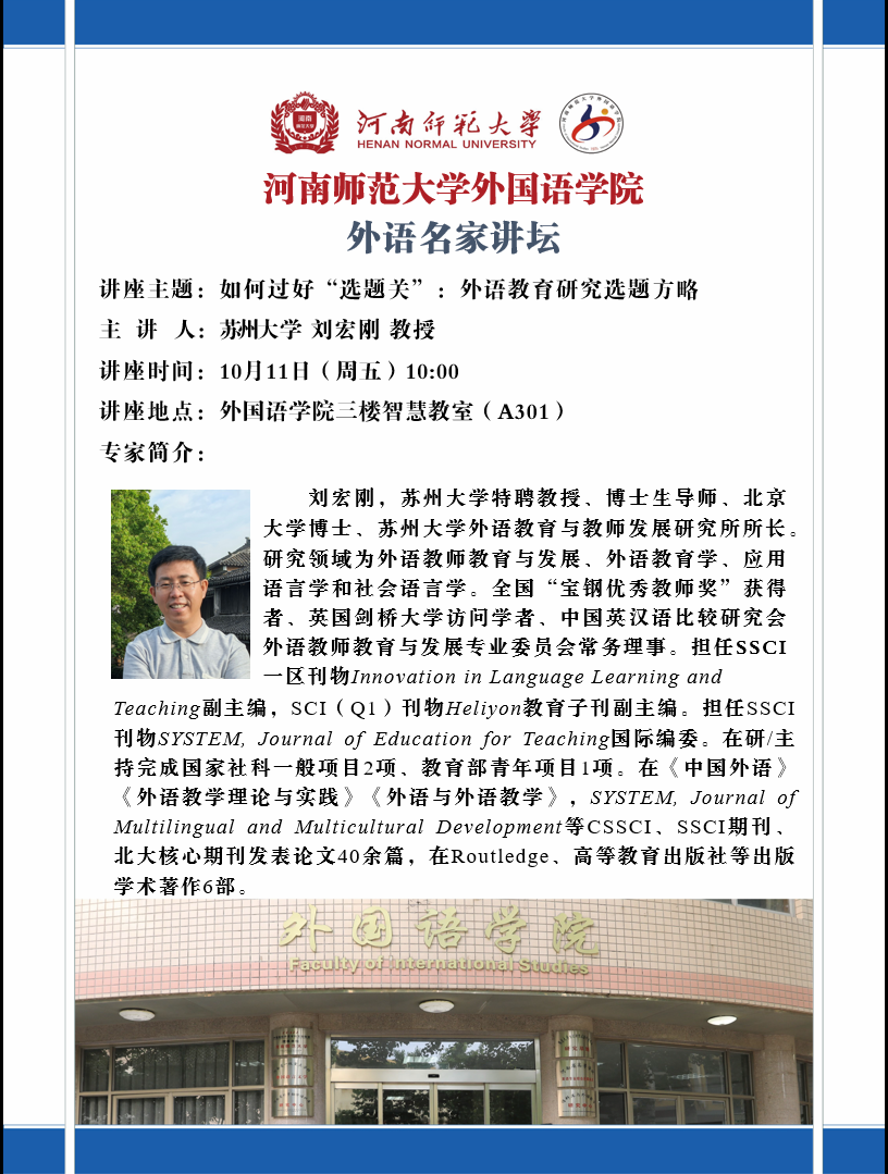 【预告】外语名家讲坛:如何过好“选题关”:外语教育研究选题方略 苏州大学 刘宏刚 教授