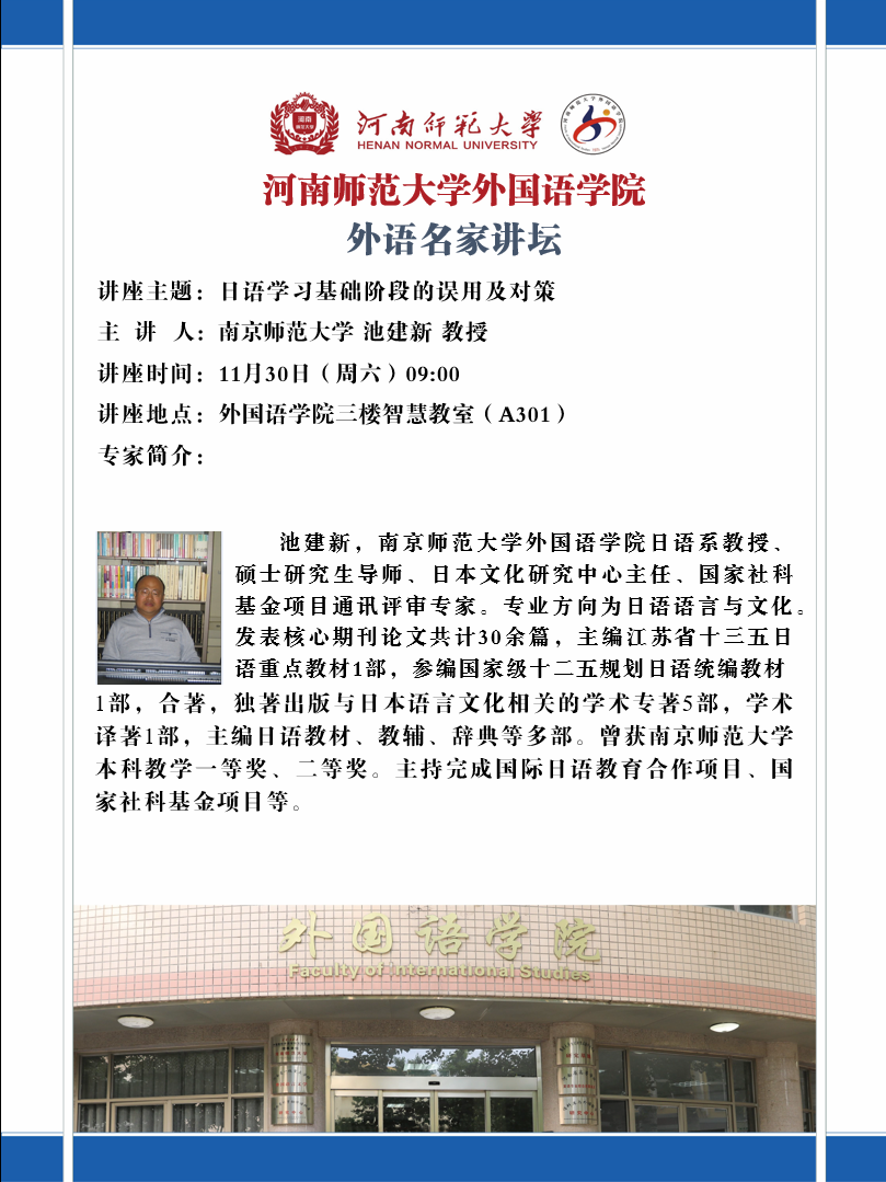 【预告】外语名家讲坛:日语学习基础阶段的误用及对策 南京师范大学 池建新 教授