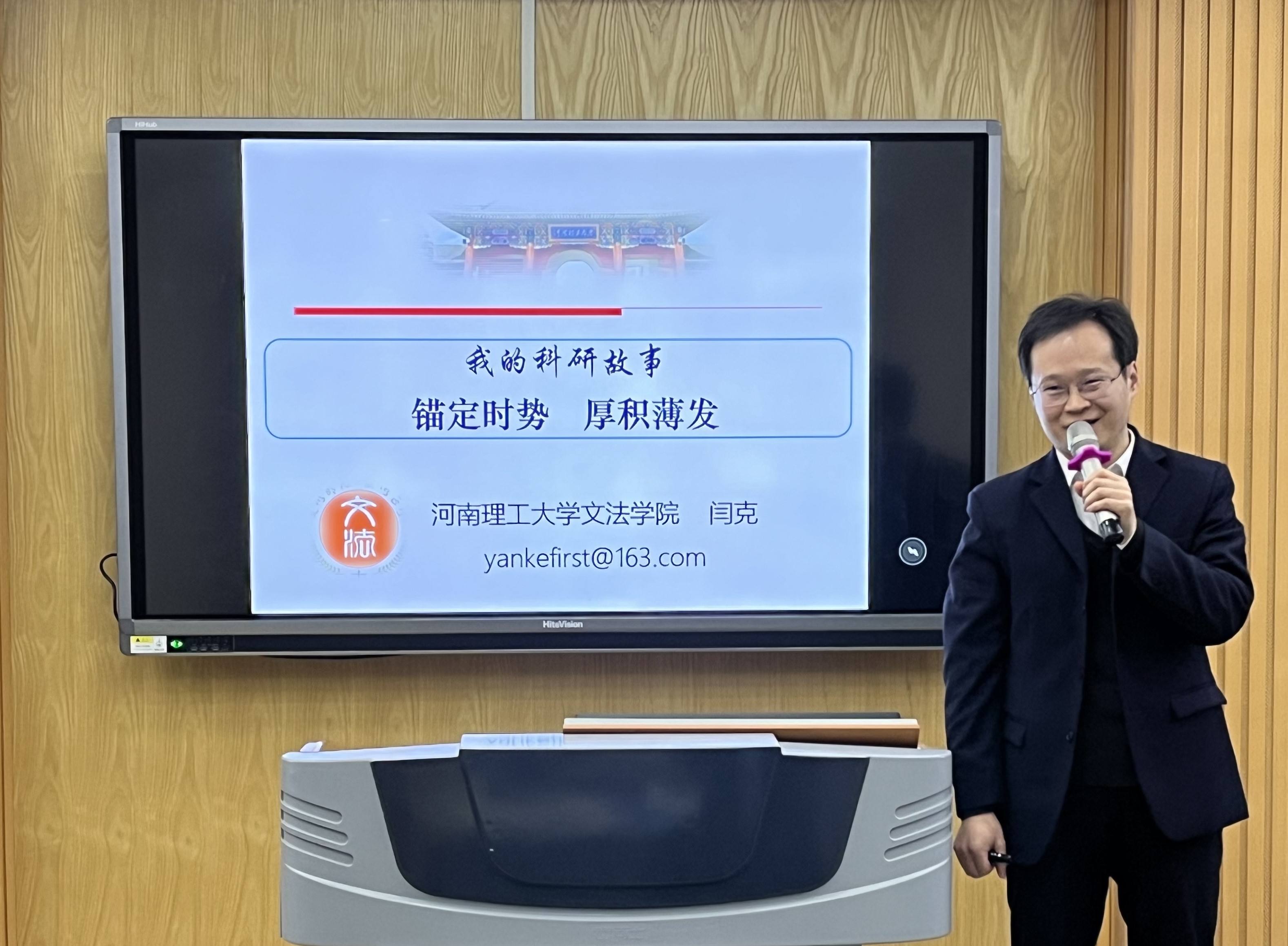11月27日,应外国语学院邀请,河南理工大学闫克副教授在学院A301室作了题为“我的科研故事——锚定时势,厚积薄发”的学术报告,学院近百名师生参会聆听。外国语学院院长刘国兵主持报告。